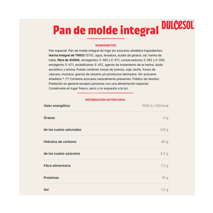 DULCESOL PAN INTEGRAL 0% AZUCARES, 395G
