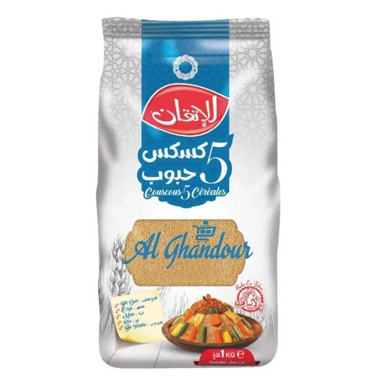 Le Couscous 5 Céréales Al Itkane 1kg est un mélange nutritif et complet composé d’orge, de blé dur, d’avoine, de seigle et de maïs. Une combinaison riche en fibres, minéraux et énergie naturelle, idéale pour une alimentation saine, équilibrée et variée. Parfait pour les recettes traditionnelles marocaines et les plats modernes.